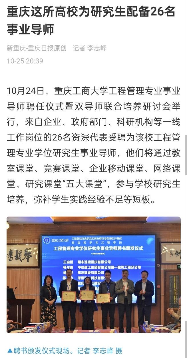 2、华龙网:《26位“事业导师”上任!333体育官网工程管理专业学位研究生实行“双导师”培养新模式》