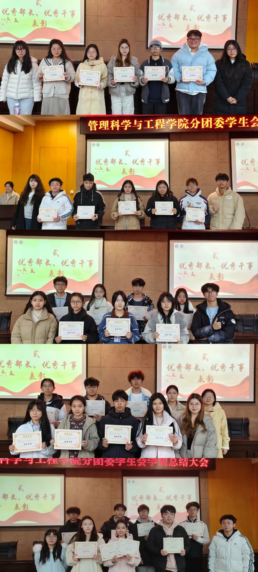 汇报结束后,进入优秀表彰环节。主持人罗颜宣读优秀部长与优秀干事表彰名单,获奖同学依次上台领取奖状,与领导合影留念。一张张荣誉证书既是对获奖同学辛勤付出的肯定,也为全体员工会成员树立了学习标杆,现场响起阵阵热烈掌声。