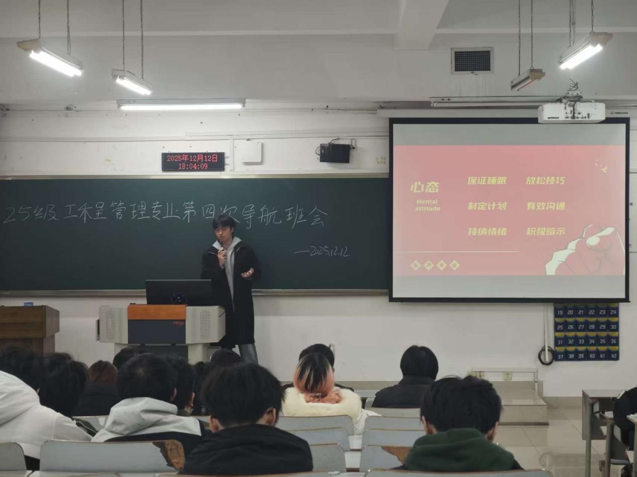 25级工程管理一至三班于12月12日开展第四次导航班会,由黄博文学长主持,110名同学参与。心态调整环节,从作息、行动、情绪等维度,分享保证睡眠、制定计划、积极暗示等六大疏压方法。期末复习拆解“三步走”策略:充裕时用思维导图搭建知识体系,紧张时聚焦核心考点背诵,冲刺阶段刷题查漏补缺,并结合往届成绩数据增强复习针对性。考场须知方面,明确四级及期末考试作弊红线,强调证件与用具准备,倡导诚信应考、平常心作答。假期规划提供旅游玩耍、陪伴亲人、实习锻炼、比赛备考四大方向,兼顾休闲与自我提升。