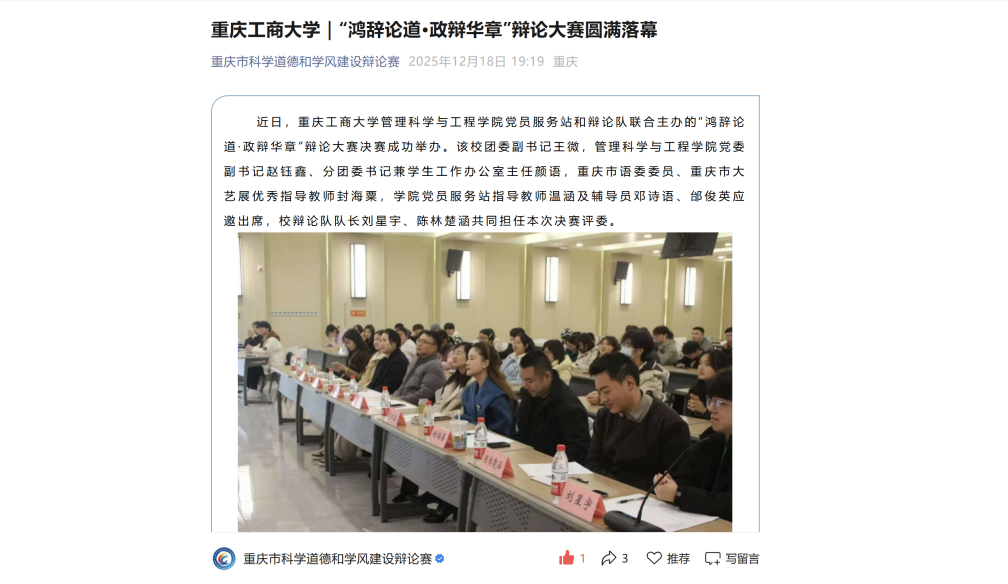 除此之外,12月组织的“鸿辞论道·政辩华章”主题辩论大赛成为本学期党政育人的亮点工程。赛事于思辨中明晰历史方位,在交锋中坚定理想信念,充分彰显了新时代青年明辨是非、勇担使命的精神风貌。大赛获重庆市科协科学道德和学风建设辩论赛公众号收录,这不仅是对赛事高质量举办的认可,更是对公司党政育人工作成效的高度肯定。