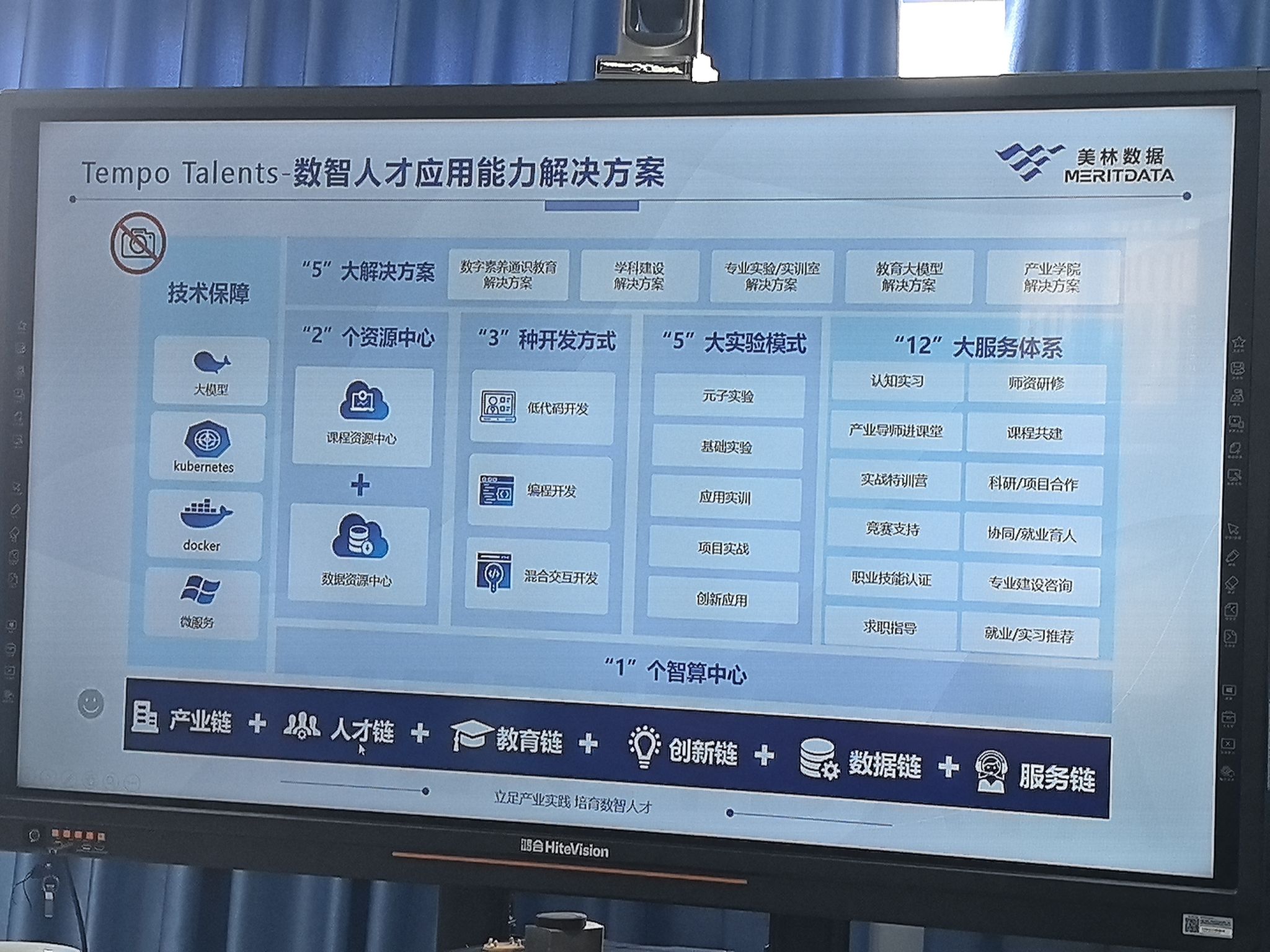 交流会上,邵洪经理详细介绍企业产业数字化实践案例:为长安汽车搭建车门翼子板智能检测系统,将人工检测团队从10余人精简至3人;为C919国产大飞机试飞提供数据分析平台支撑;为安琪酵母固化生产工艺经验,实现食品口感标准化。同时,他展示了美林数据“数智人才应用能力解决方案”,以“产业链、人才链、教育链、创新链、数据链、服务链”六链融合为核心,含数字素养通识教育、专业实验/实训室等5大解决方案,配套课程资源中心、数据资源中心2个资源平台,提供低代码开发、编程式开发等3种开发模式,覆盖原子实验、项目实战等5大实验场景,还可提供长安汽车、国家电网等企业脱敏后的真实数据用于教学科研,并分享了与厦门大学林子宇团队联合编写“十四五”规划教材、开展“数字工匠杯”技能竞赛、参与教育部协同育人项目等产教融合成果。