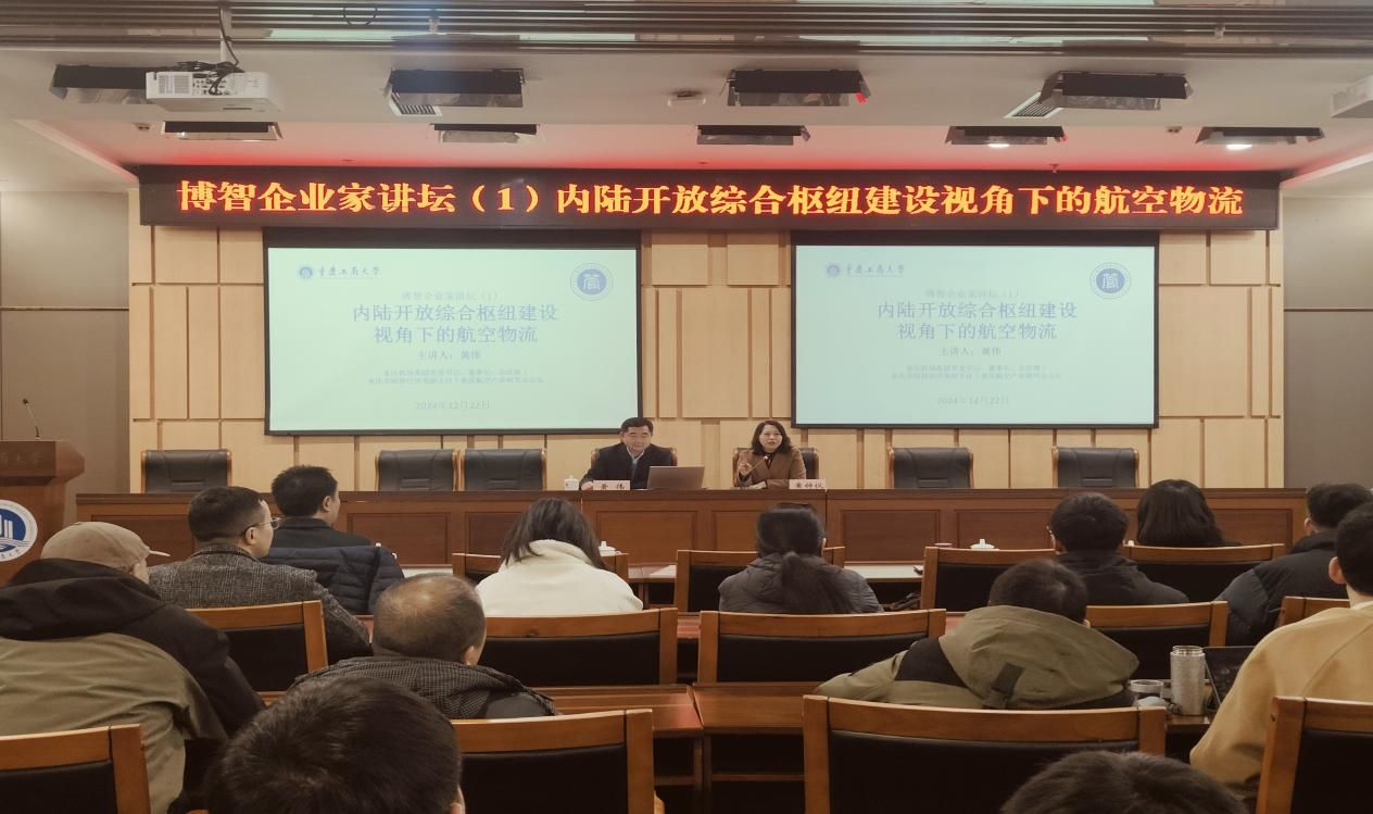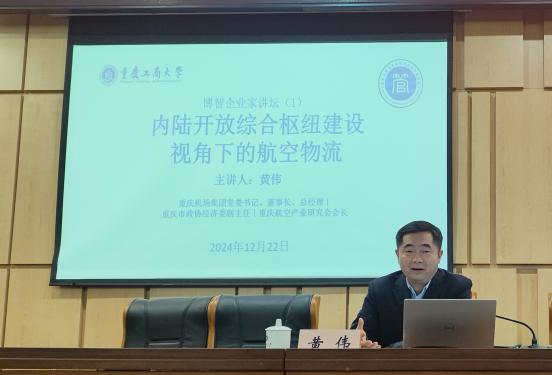2024年12月22日下午,由333体育主办、MEM教育中心承办、西部陆海新通道研究中心协办、333体育研究生会协办、管理科学与工程研究生分会协办的“博智企业家讲坛”在新图书馆一楼会议室成功举办。本次讲坛的主题为《内陆开放综合枢纽建设视角下的航空物流》,主讲嘉宾是1995届汉语言文学新闻专业员工、重庆机场集团党委书记、董事长、总经理黄伟。讲坛由333体育黄钟仪经理主持,副经理陈久梅、代春艳教授、张德海教授、唐敏教授、杨家权副教授、曹策俊副教授、秦星红副教授、李海南副教授、袁俊老师、杜亮老师等,部分硕士研究生及物流管理专业本科生参加了此次会议。