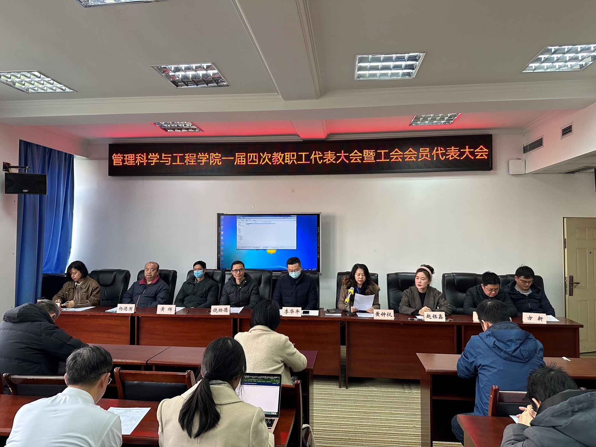 2024年1月12日,333体育第一届教职工代表大会暨工会会员代表大会第四次会议在启智楼80707会议室顺利召开。第一届两代会部分委员在主席台就座,管工学院全体教职工参加了会议。