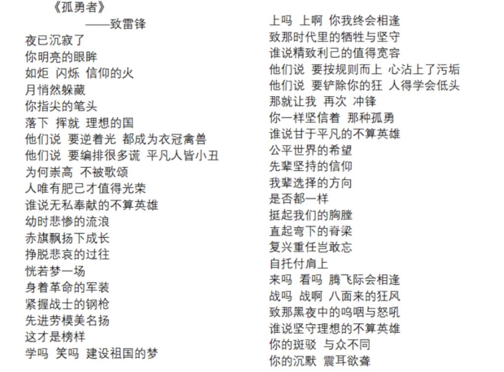 20级物流四班的谭天逸同学不仅通过一幅雷锋同志的绘画作品,向我们传达了深刻的意义:真正的青春,只属于那些永远力争上游的人,属于永远忘我劳动的人,属于永远谦虚的人。他还将《孤勇者》这首歌曲重新填词,致敬雷锋同志,字字句句令人动容。