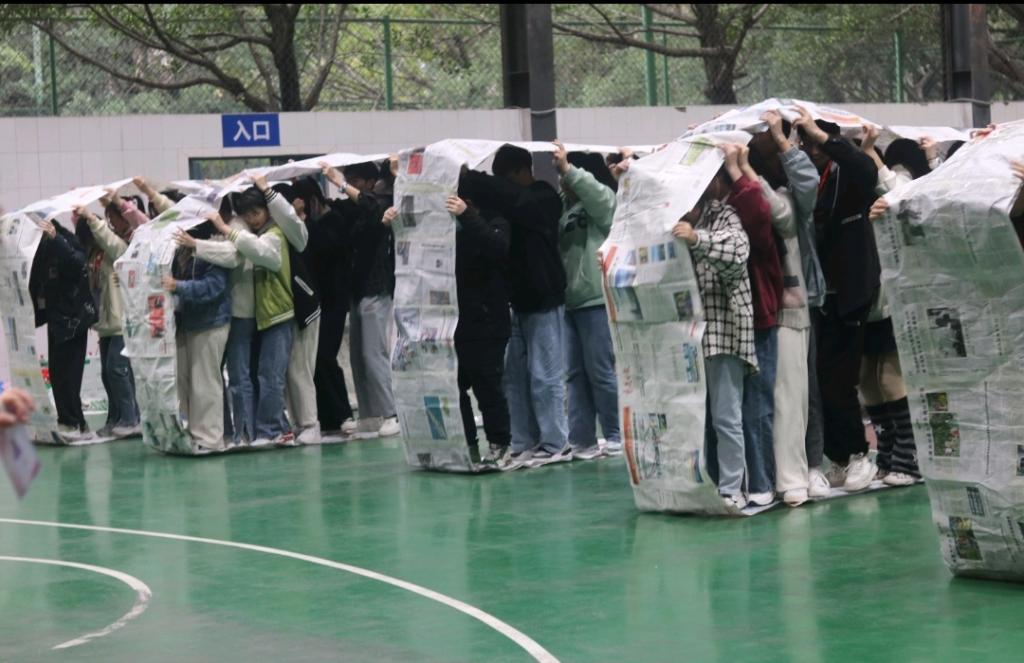本次素质拓展活动以团队形式进行。全体成员被随机分为12个组,每个组快速为自己的组取好名字后,振奋人心的素质拓展活动就正式拉开帷幕啦!首先进行的是我们的第一个游戏——无敌风火轮。每个队用报纸围成一个可以行进的履带式的环并顺着环内侧向前滚动,以最快到达终点的组为优胜。开场第一个游戏,大家都斗志满满,密切合作克服困难,由于大多数干事是第一次尝试无敌风火轮项目,且该游戏具有一定的挑战性,