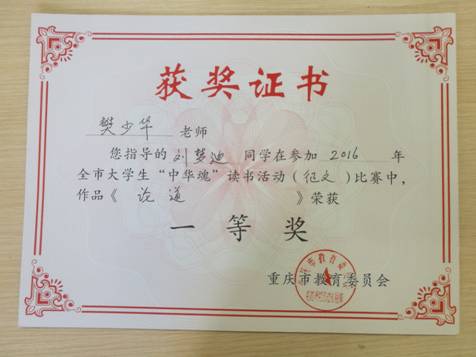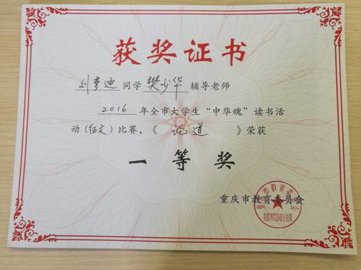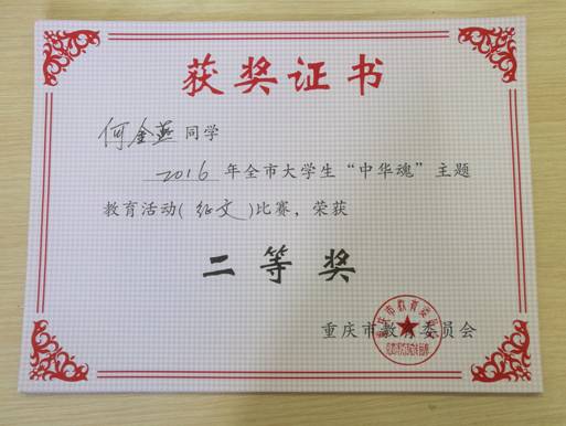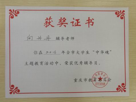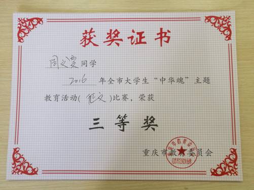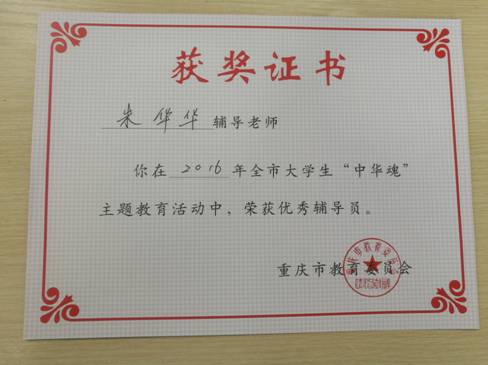 重庆市2016年“中华魂”主题教育活动由重庆市委宣传部、市关工委、市文明办、市教委、市文化广电局、市新闻出版局、团市委联合举办。公司“中华魂”主题教育活动由校关工委牵头组织,公司关工委高度重视重庆市“中华魂”主题教育活动,学院关工委主任叶海林副书记专门召开“中华魂”读书征文活动动员大会,全院班级认真组织,在各班级辅导员老师精心组织、耐心指导,同学们踊跃参与下,公司读书征文活动得到重庆市教委的认可和奖励。樊少华老师获得重庆市教委征文优秀指导老师;向丹丹、朱华朱老师获得重庆市教委征文优秀辅导员;刘梦迪同学获得征文重庆市一等奖、何金燕同学获得征文重庆市二等奖、周文雯同学获得征文重庆市三等奖。
