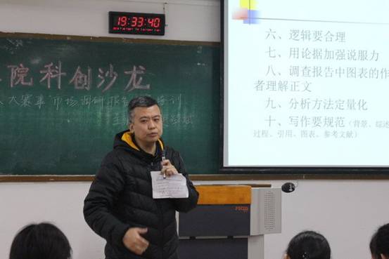 2016年12月22日晚19:00,商务策划学院科创沙龙(十六)暨第十四届员工科研“六大赛事”市场调研报告培训在博智楼07201准时举行,本次沙龙由史学斌老师主讲,邓艺老师担任本次沙龙主持。