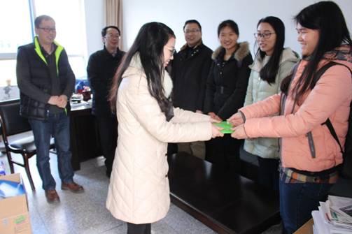2016年1月12日下午,333体育官网员工处副处长蒋年韬、勤工书报亭指导老师谭文全,以及勤工书报亭三名员工代表,在明德楼4001办公室将义卖的收入共计13276.6元送到冯晓的辅导员禹洋春手中。