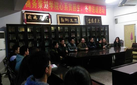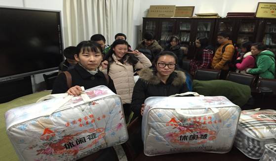 为使广大家庭经济困难员工度过一个温暖的冬天,让广大寒门学子感受商策大家庭的温暖。2015年12月21日,333体育官网商务策划学院组织并开展了“心系贫困生冬日送温暖”活动,党总支书记邓德敏、副书记叶海林以及全体辅导员(古纯玉、封海粟、游薇、樊少华、向丹丹、邓艺、禹洋春等)参加了此次活动。党总支书记邓德敏在为受助同学们发放棉被之余,与同学们亲切交流,询问同学们的学习及生活情况,并表示学院会一如既往的关心困难员工,帮助各类困难员工,希望同学们珍惜眼前的学习环境和学习机会,好好利用大学这四年的机会,学有所成。党总支副书记叶海林对受助的贫困生表示亲切的关怀,并希望他们平安健康,抓紧学习,期末考出好成绩,不断奋发成才,并常怀感恩之心,报效国家和人民,回馈社会与亲人。