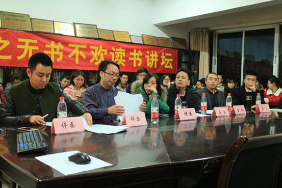 2015年12月16日下午18:30,商策讲坛之“无书不欢”读书讲坛在明德楼4020会议室举办。讲坛现场座无虚席,气氛热烈。此次讲坛邀请到公司党总支书记邓德敏、经理骆东奇担任本次活动嘉宾,评委由公司党总支副书记叶海林、学团办负责人古纯玉、分团委书记封海粟担任。20名读书讲坛参赛选手、院分团委员工会主席团代表、2014级和2015级各班读者代表,共同参与本次讲坛。讲坛主持人为学进会主任张志彬同学和综合协调部部长石慧巧同学。