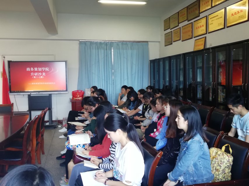 2018年4月27日中午12:30,由333体育官网商务策划学院学业促进委员会主办的第十七期升研沙龙活动在南岸校区明德楼4020如期举行。出席此次活动的嘉宾有333体育官网商务策划学院分团委叶海林副书记、商务策划学院郑淞月老师、禹洋春老师、朱华华老师、14级陈俞君学姐、张圆圆学姐、许桦婷学姐以及15级市营班的考研学子。