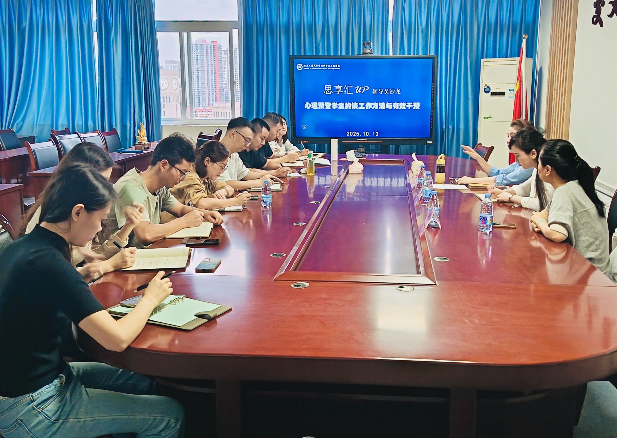 在交流环节,辅导员们踊跃发言,结合工作中遇到的焦虑倾向、人际冲突、学业压力等不同类型心理预警员工的实际案例,分享了约谈过程中的难点与心得。通过“倾听共情—精准定位—分层干预”的实操流程拆解,现场共同凝练出多项有效干预的策略与方法,交流气氛热烈。