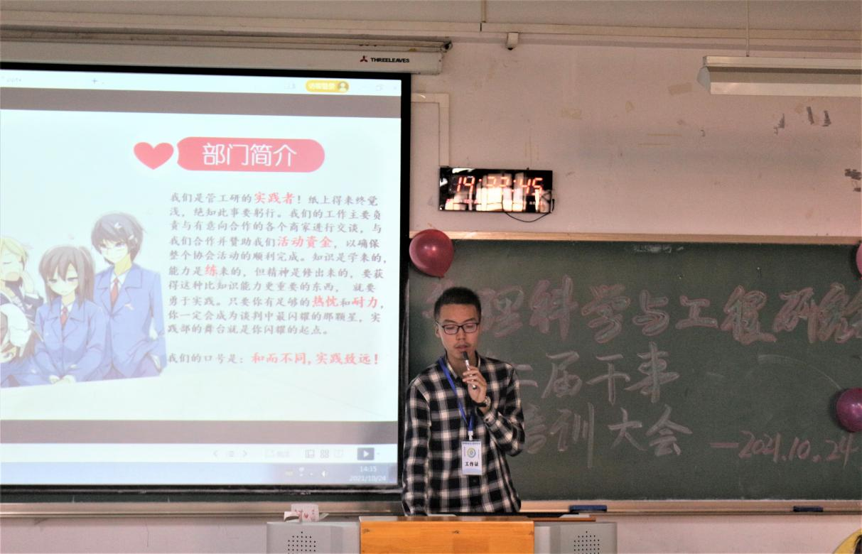 首先,会长团成员李俊播放了第一届管理科学与工程研究会所举办活动的短视频,并从工作内容、要求等方面对管理科学与工程研究会进行了简单介绍。他提到,协会的工作主要是承办一些赛事,加入管工研应该具有“四心”,即真诚心、责任心、积极心和爱心。作为管工研的一份子,要为协会的未来作出自己的努力,共同建设更好的大家庭。