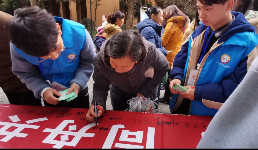 下午两点,活动正式开始。本次活动主要以设立专业义诊咨询台、发放防艾抗疫宣传单,开展娱乐小游戏,有奖问答等形式来宣传防艾抗疫的相关知识。在志愿者的宣传下,活动现场的居民逐渐增多。首先,医生代表严医生为在座的居民讲解了很多有关防艾和抗疫的知识,让居民正确认识疫情和艾滋对个人生活的影响。随后志愿者带来的一首诗朗诵《一封艾滋孤儿的信》让大家了解到艾滋病患者内心的真实感受,真正地去关爱弱势群体。除此之外,志愿者还分享了一些抗疫期间感人小故事、演唱歌曲《拥抱你》、表演手语舞《国家》,用各种形式调动现场的气氛。紧接着,志愿者将游戏与防艾抗疫知识相结合,寓教于乐,让居民在参与游戏的过程中逐渐认识到艾滋病的危害和防艾抗疫的重要性。最后,居民在活动横幅上签下自己的名字,并与志愿者合影留念。