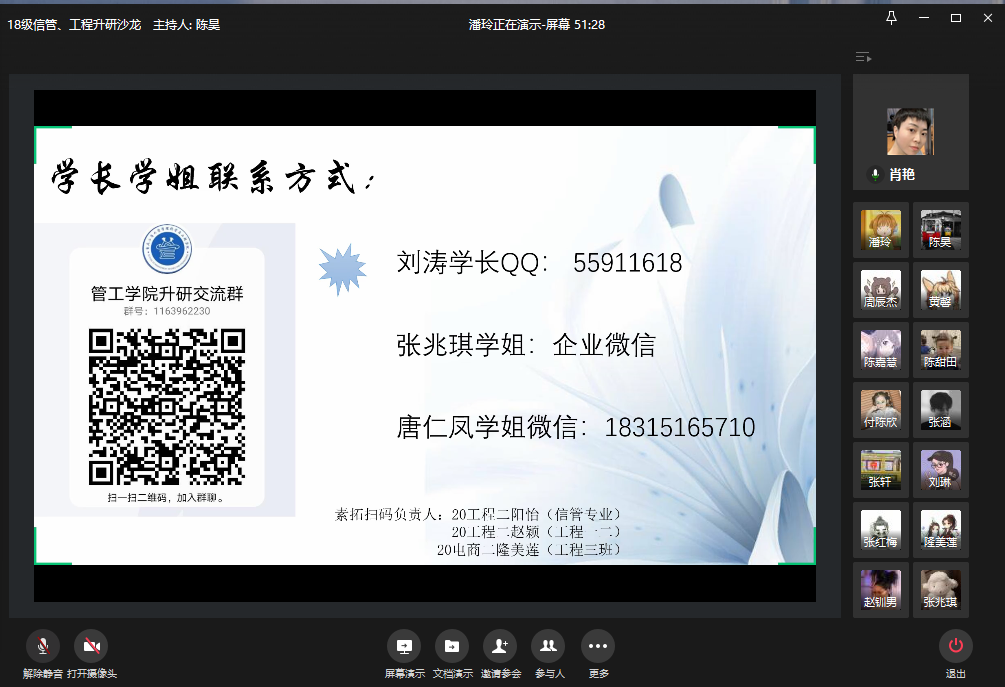2020年12月3日下午12:40,公司于企业微信举行了18级信管、工程升研沙龙。公司分党委副书记陈春洁、工程管理系主任肖艳、辅导员邓艺参与本次活动。升研自16级信管、工管专业的学长学姐、优秀员工——现就读于本校企业管理专业的张兆琪、云南大学的刘涛、华中师范大学的唐仁凤,为公司17信息管理和工程管理专业学子,分享升研技巧和经验。本次升研沙龙,分享、聆听和学习的在线人数多达120余人。