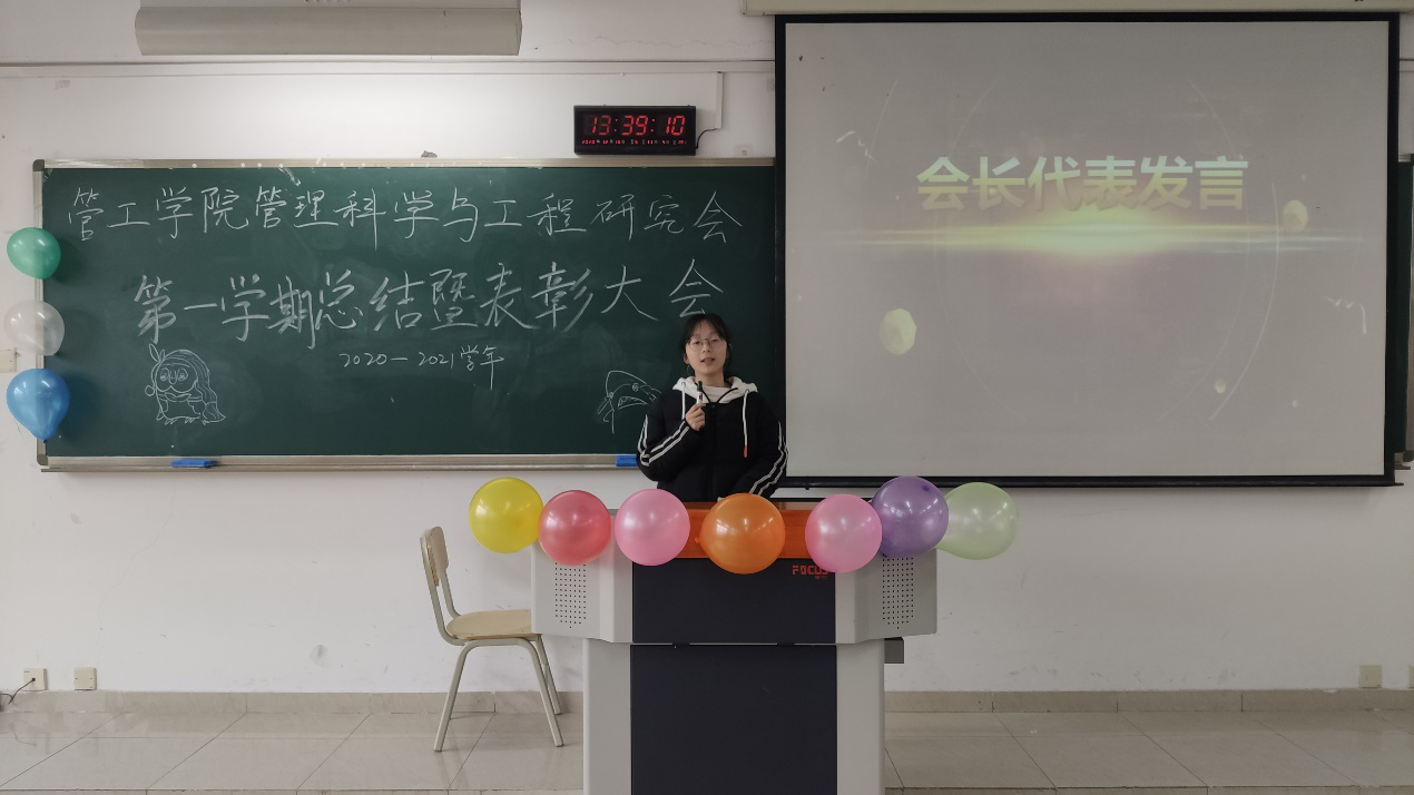 随后,会长代表曹恬恬上台发言,不仅对管理科学与工程研究会本学期的工作进行了总结,还表达了自己对管工研未来的展望,我们组织虽是第一届,但是更加需要我们的努力,希望在我们的共同努力下能将管理科学与工程研究会建设得越来越好,也希望大家都能在工作中有所收获有所提高。