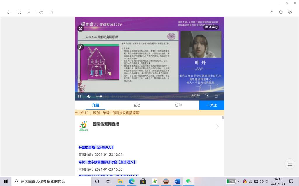 2021年1月23日到1月31日,清华大学·大同第二届能源转型国际论坛暨碳中和愿景下能源转型路径研讨会顺利召开。本次论坛由清华大学社科学院、大同市人民政府主办;北京国际能源专家俱乐部、亚洲开发银行能源部门、北京大学能源研究院、中国科学院电工所联合主办;隆基股份、通威集团、正泰集团、中来股份协办;国际能源网、大同市全科盟新能源研究院承办。此届论坛在山西大同设立主会场,并面向全球直播,共举办11场专题论坛和11场报告会,累计观看直播人数达114.66万。公司333体育代春艳教授主持的国家重点研发计划政府间合作专项“EIR计划-新型城镇能源互联系统研究与试点应用 ”(项目编号:SQ8YFE196500)项目组(简称EIR计划项目组)深度参与了此次论坛。