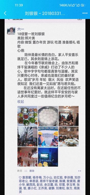 与此同时,参与活动的员工还将劳动成果用照片或视频的形式保存下来,添上自己的劳动感悟或心得分享到微信朋友圈,并积极参与公司分团委员工会举办的#管工学子以劳尽孝#话题分享会,在QQ上分享、展示自己以劳尽孝的事迹。本次活动参与人数共计695人,其中官Q发起的#管工学子以劳尽孝#话题浏览次数达5149次。活动最后评选出9个优秀班级及10名优秀个人,以资奖励。