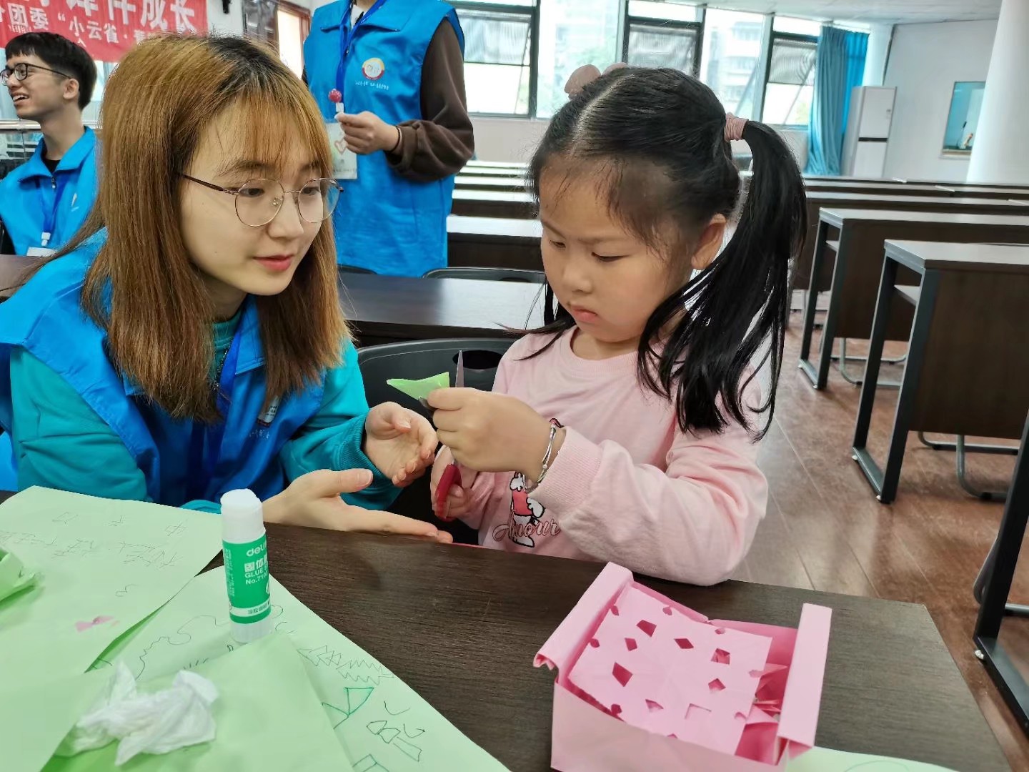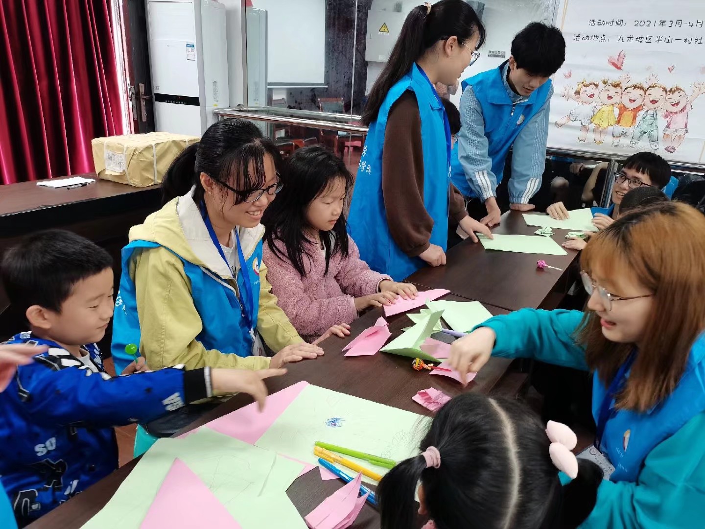 此次互动分为上午和下午两个时间段,伴随着清晨的暖阳,志愿者们早早到达活动地点。十点活动准时开始,首先进行的第一个活动是口才训练,孩子们认真学习着一个个绕口令,纠错对练、矫正发音、吐字清晰,真真提升孩子们的口才表达能力,让他们受益匪浅。紧接着进行了剪纸活动,剪纸作为中国传统文化,在图形塑造和一折一剪下,一张栩栩如生的图画便孕育而生,寄托着人们对美好生活的向往。志愿者与孩子们一起合作,完成了一个个精美的作品。在下午的活动中,志愿者给小朋友讲解了垃圾分类知识,并进行了简单的作业辅导。最后伴随着孩子们与志愿者的欢声笑语,活动接近了尾声,大家都依依不舍的道别。