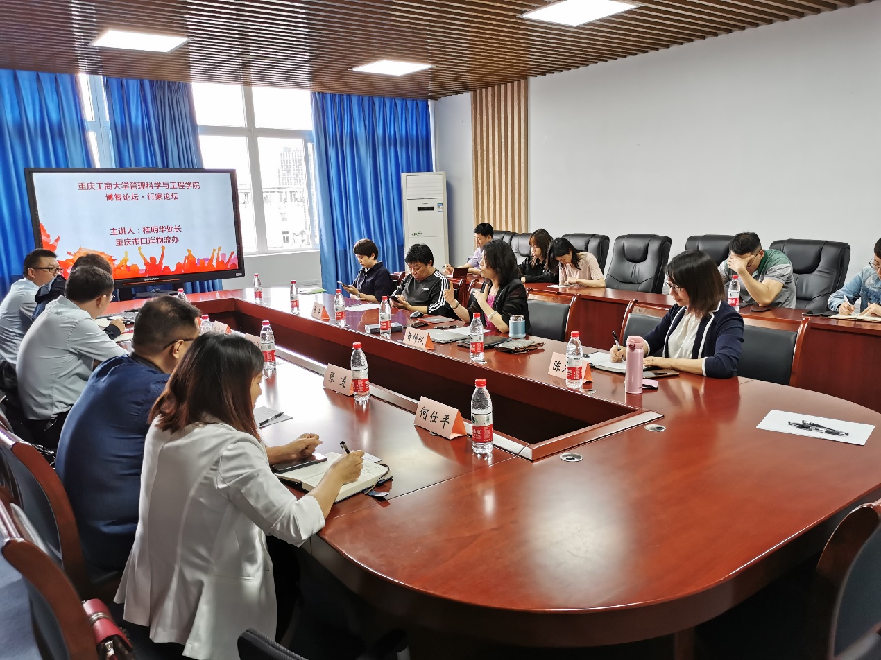 专题讲座中桂明华处长为全院师生详细介绍了重庆市国际物流通道物流、开放高地及多式联运等方面的发展现状,以及重庆市物流中长期发展规划中关于对国际物流通道与多式联运发展战略定位、规划布局和主要任务等。最后,桂处还与重庆交运物流有限公司总经理熊志刚、重庆昶阅供应链管理集团有限公司张进以及333体育陈久梅副经理和张军、周继祥、龚英、邱晗光、常建鹏、曹策俊等老师以及部分物流管理专业硕士研究生进行了积极的交流和讨论。