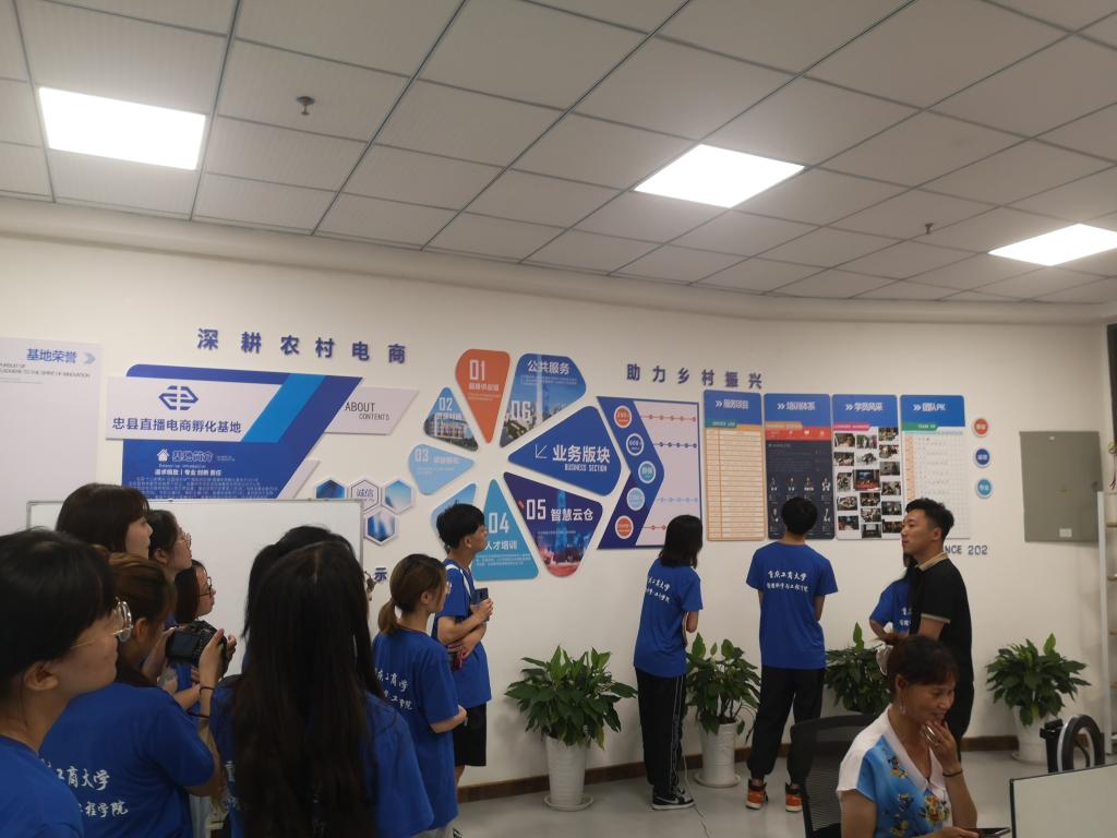 首先,实践团成员来到了忠县直播电商孵化基地,这里是忠县打造本土电商直播人才的核心输出力量。“我们培养的电商人才不论学历、长相,想要回归到传统电商,最注重的是产品质量,只有质量过硬,我们的直播电商才会真正取得成效。”孵化基地负责人罗总介绍到。
