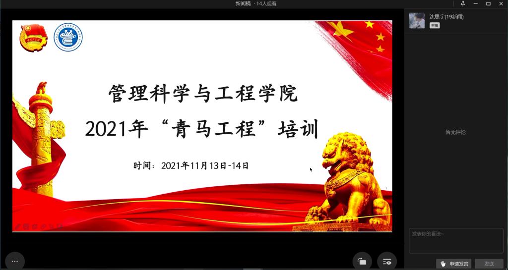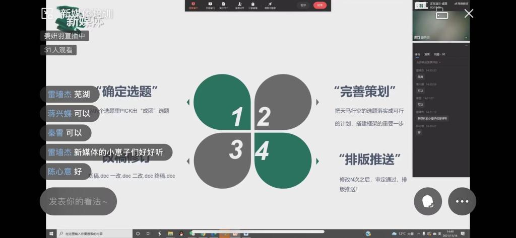 11月13日至14日, 为加强333体育员工组织各宣传部门成员对新闻工作的理解,掌握更多实用技巧,公司邀请校新闻中心视频部部门负责人朱洁、新媒体运营部部门负责人姜妍羽、文新学院19级新闻专业沈思宇和333体育新闻中心设计部部门负责人银秋钰、朱骏辉分别为参加培训的人员在视频剪辑、新媒体运营、ps及新闻稿撰写等方面展开能力培训。此次培训以线上直播的形式进行。