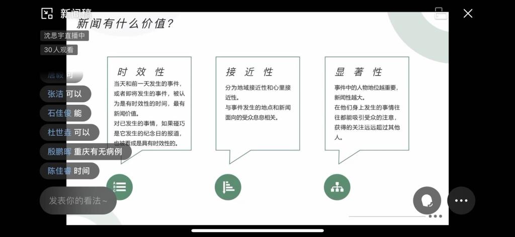 与此同时,来自文新学院19级新闻专业的沈思宇同学为大家进行了新闻稿撰写工作的相关培训。她以实时疫情为着力点,引用了陆定一的说辞“新闻就是最近发生的事实报道”,将新闻的概念呈现在大家眼前。她指出,新闻就是“新”、“事实”、“报道”,并强调新闻应具有时效性、接近性、显著性、影响性以及人情味。紧接着沈思宇同学以新闻稿框架的书写格式为中心,分别从“标题”、“导语”、“主体”、“补充”、“结尾”五个部分进行了详细的讲述并结合写稿的思路和文章结构给出了许多专业性的建议。