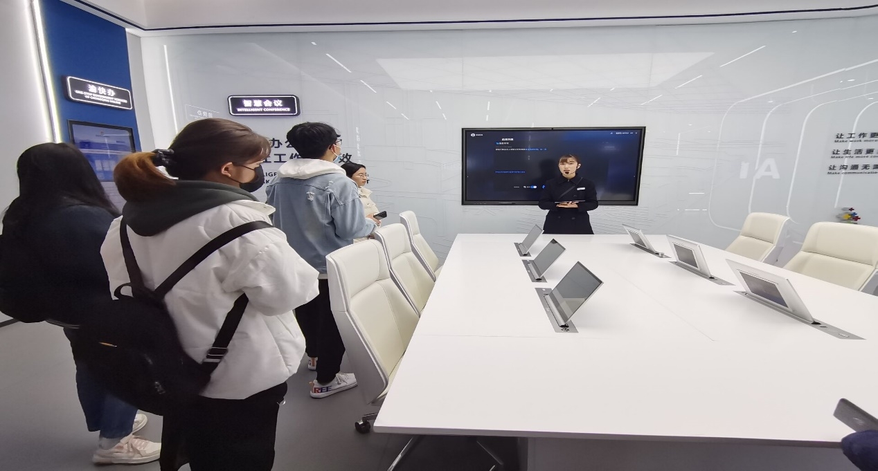 在这里,成员们跟随讲解员的步伐参观各个展厅。通过讲解员的介绍,他们详细了解了科技应用在生活中的产品,比如已经投入使用的无人驾驶汽车、能对病例提供AI建议的智慧医疗服务、能够制定个性化学习方案的智慧教育服务、能够足不出户感受世界奇观的智慧旅游服务等。团队成员还与虚拟人物进行合影。