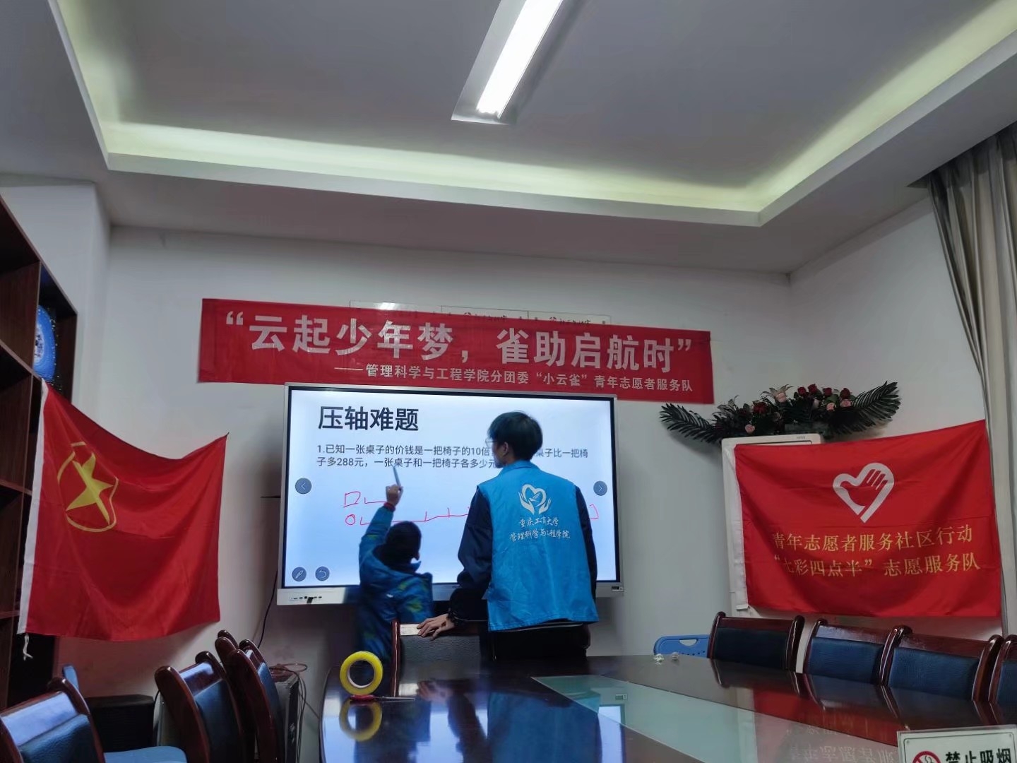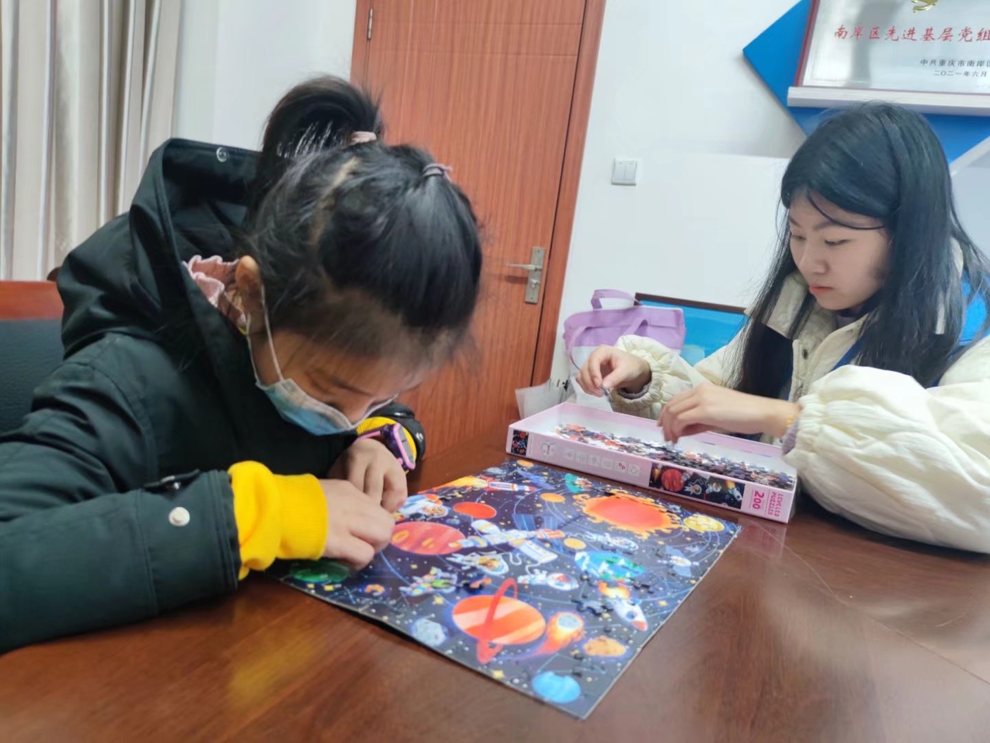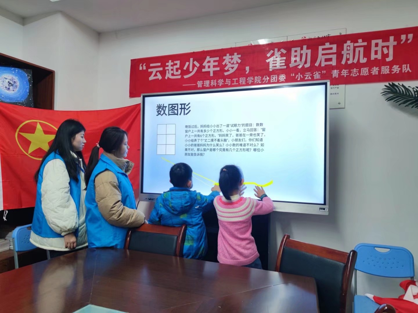 下午14时,全体志愿者再次到达活动场地,志愿者们和小朋友们开展了益智拼图游戏,在拼图过程中,志愿者和小朋友们相互协作,共同努力,最后取得了成功。接下来志愿者们开始了数学竞赛课,小朋友们积极回答问题,展现了对数学的浓厚兴趣,这种方式既锻炼了孩子们的运算思维能力,也提高了孩子们的学习兴趣,真正做到了学中有乐,乐中有学。最终,一天的活动以志愿者们和小朋友们一张灿烂的合照画上了圆满的句号。