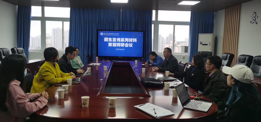 2022年4月1日下午,在启智楼80709会议室举办2022年招生宣传系列材料策划调研会,学院书记邓德敏、经理黄钟仪、教学副经理陈久梅,大数据管理与应用、工程管理、物流管理、电子商务各专业的系主任和云招考教育科技公司策划人员参加此次会议。