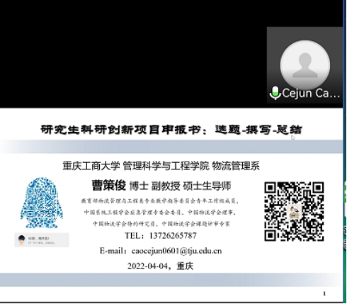 为加强公司研究生科研创新能力培养,鼓励在校研究生积极承担创新性研究课题,提高公司产品质量。2022年4月6日上午10点,管工学院邀请物流管理系曹策俊博士在线上为研究生指导申报《2022年市级、校级研究生创新项目》讲座。管工学院研究生全员参加。