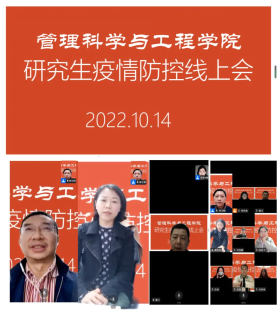 管工学院10月14日在线上召开了研究生疫情防控会。黄钟仪经理,李华平书记,詹川副经理及研究生秘书、辅导员和84名研究生都参加了会议。李书记首先宣讲了国家和学校的防疫政策。希望同学门不要过于恐慌,树立科学、理性的态度,不信谣、不传谣、不造谣,主动参与辟谣工作,心怀感恩,严格遵守学校防控指挥部的规定。黄经理提醒同学们做好个人防护,戴口罩,勤消毒,保持充足睡眠,增强自身免疫力。要互相帮助,团结友爱,资源共享,自觉维护防控疫情大局。詹副经理对同学们这期间的学习做了指导和要求,并对提出的问题一一解答。接下来研究生秘书、辅导员和员工代表都发了言。最后研究生分会主席毛陈陈同学朗读了《管工学院研分会倡议书》,表达了对这次疫情中战斗在一线的老师和教职工的感恩和敬意,号召管工研究生积极行动起来,抗疫攻坚,做好表率作用,展现了管工学子的大局意识、责任与担当。