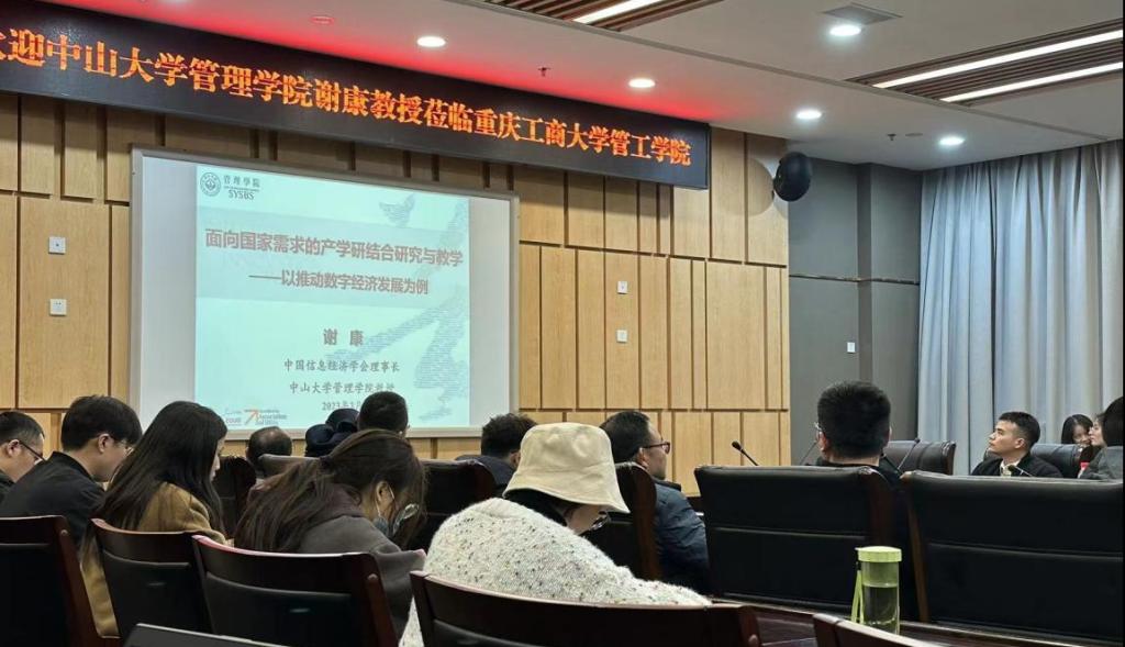 黄经理首先对谢康教授的到来表示了热烈欢迎,并向大家做了介绍:谢康,中山大学管理学院教授、中国信息经济学会理事长。主要研究领域是信息经济学、电子商务经济学、企业信息化、信息化管理与工程、人力资源管理管理质量、企业激励机制与绩效评估设计。然后,谢康教授主要从学科交叉融合的实践创新、学科交叉融合的理论创新和学科交叉融合的公司产品三方面来展开讲解。谢教授首先介绍了企业信息化与工业化融合正是企业信息化的第三个阶段,2010-2015年期间中国企业信息化的主要特征是工业化体系内支持规模高速成长,降本增效,精益管控。随后,谢教授总结了企业数字化转型实践的特征有:一是企业数字化转型与数字创新之间没有明确的边界,二者相互融合,相互影响;二是中国情境的企业数字化转型不仅是企业的战略变革,而且是企业在新常态下谋求高质量发展的路径。在此基础上,谢康教授向各位老师和同学们提出问题“企业数字化转型与以往工业转型升级有何异同?”“数字创新与以往工业创新有何异同?”。老师和同学们展开了热烈的讨论、积极交流意见,会场气氛热烈融洽。谢康教授进一步对学科交叉融合的理论创新进行了详细介绍,他指出,互联网环境下企业与消费者的关系不再是以往单项服务或信息传递关系,更多地表现为双向互动关系,企业动态能力也从侧重于外部环境与动态能力的单向因果关系,扩展为双向因果关系,即企业与消费者协同演化动态能力。最后,谢康教授向大家分享了他在案例研究中的心得体会,针对案例研究中多方法结合的常见陷阱,提出可以采取同一主题纵向递进的策略:首先,针对同一研究主题,以探索性案例为起点,提炼出新概念或新的理论框架;其次,根据案例研究的情境,提出研究假设,构建模型展开规范研究;最后,通过计量分析或其他实证研究方法进行检验或验证。