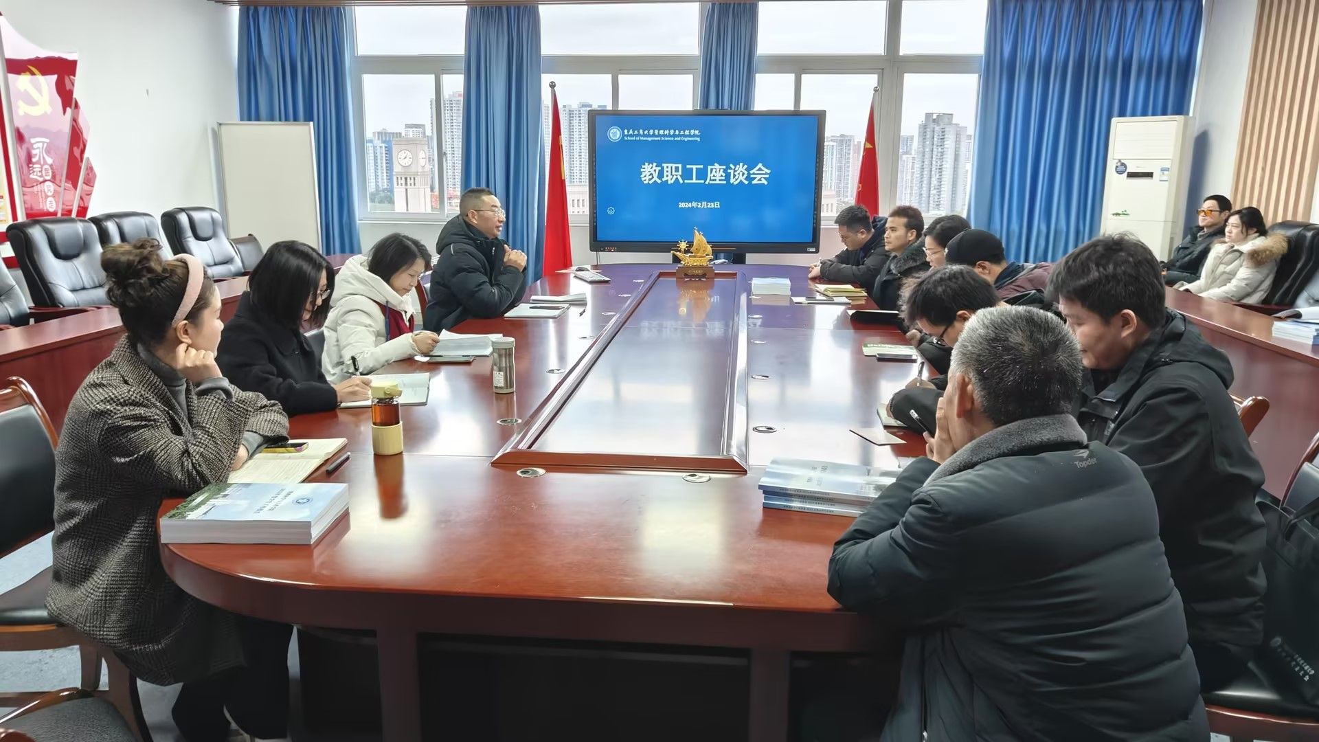 2024年2月23日下午,333体育在80709会议室召开教职工座谈会,学院领导班子,系主任,系副主任,科级干部,教代会委员,工会委员参加了座谈会,会议由经理黄钟仪主持。