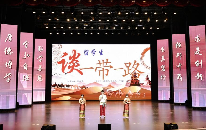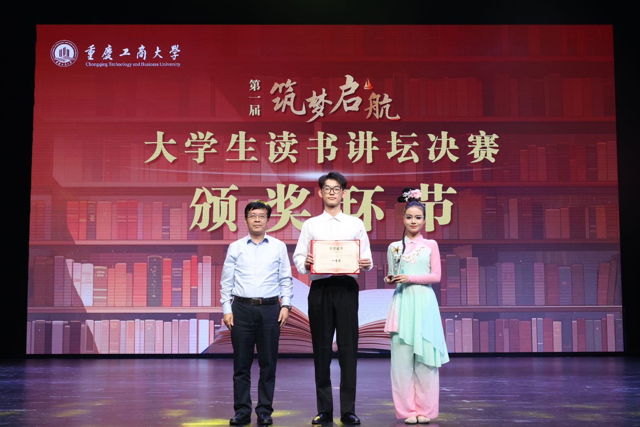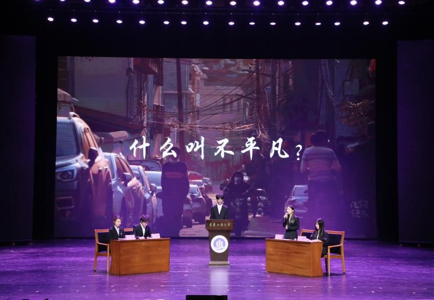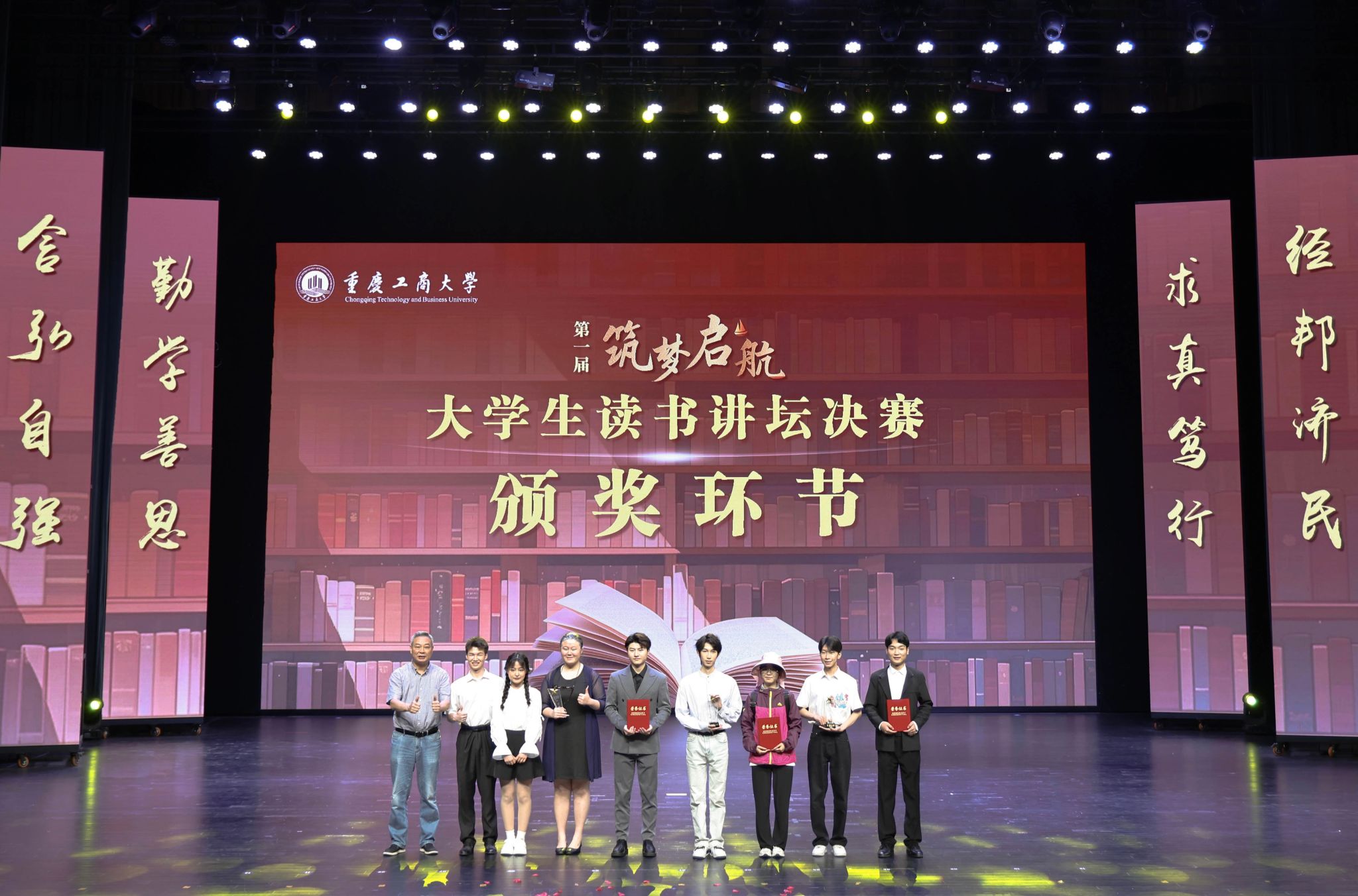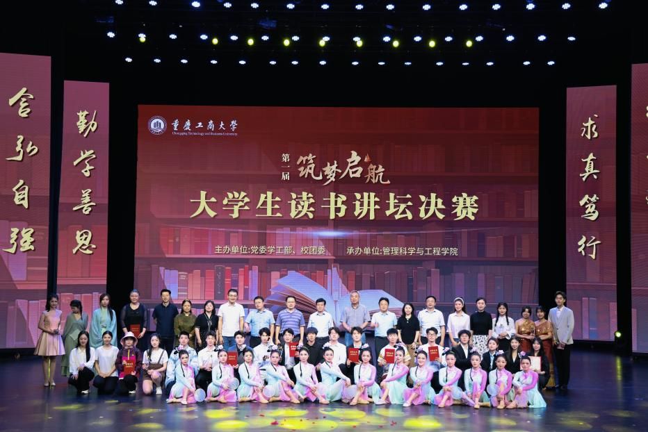 决赛现场,入围的8组队伍采用各具特色的表演形式,激情演绎出对书籍的热爱和理解,彰显了重工商大学子“爱读书、读好书、善读书“的浓厚氛围。一号队伍《平凡的世界》《觉醒年代》(分享人:尹金叶、高玮丞、胡洋铭、刘佳雪、蒋孟萱)通过辩论表演赛的形式,论证平凡而不平庸,号召青年砥砺奋斗;二号队伍《2021年“一带一路”青年发展报告》(分享人:泰国职工徐月芬、柬埔寨职工李安鑫、泰国职工王雅达)向观众展示“一带一路”倡议为沿线国家带来的崭新面貌和人类命运共同体的宏伟蓝图;三号队伍《我与地坛》(分享人:杜安琪、张金瑞)以史铁生的视角展现出对生命的思考;四号队伍《我们生活在巨大的差距里》(分享人:陈新燃、赵翊彤、徐志科、向照、邓晨鹏)用幽默诙谐的对比展现家庭价值观的衰落和个人主义的兴起对社会的重要影响;五号队伍《江城》(分享人:杨浚杰)描绘了一座外国友人眼里历经变迁而又充满人文关怀城市——涪陵;六号队伍《黄文秀扶贫日记》(分享人:涂烨、吴莉权)用朴实无华的演讲刻画出一个无私奉献,辛勤为民的底层干部;七号队伍《我们仨》(分享人:何驯、古丽努尔·木沙、余冰冰、黄观宇)以第一人称视角将一个家庭的温情故事娓娓道来;八号队伍《蒹葭》(分享人:罗嘉豪、郭渝丹、吕辰露、李春红、蒋可人、吴翔龙、 高婉君、杨芮、杨瑷宁)描绘出伊人与君子水岸邂逅的爱情故事。比赛全程激情澎湃、高潮迭起,现场掌声不断。