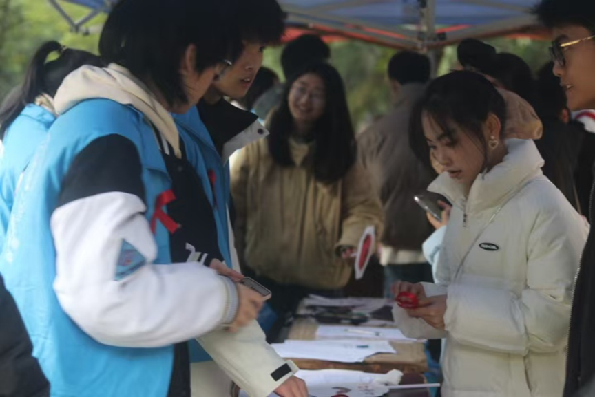 活动伊始,醒目的防艾宣传标语便吸引了诸多同学的注意。同学们驻足于防艾展板前,细心阅读宣传海报的防艾知识,展示了老员工对预防艾滋病颇为重视。志愿者们面带微笑,手持宣传资料,热情而耐心地为每一位前来咨询的人们答疑解惑。同学们都积极地参与此次活动,将防艾宣传推文分享在朋友圈,大家就像传播接力棒的使者,让“防艾不防爱”的安全意识围绕在同学们的身边。
