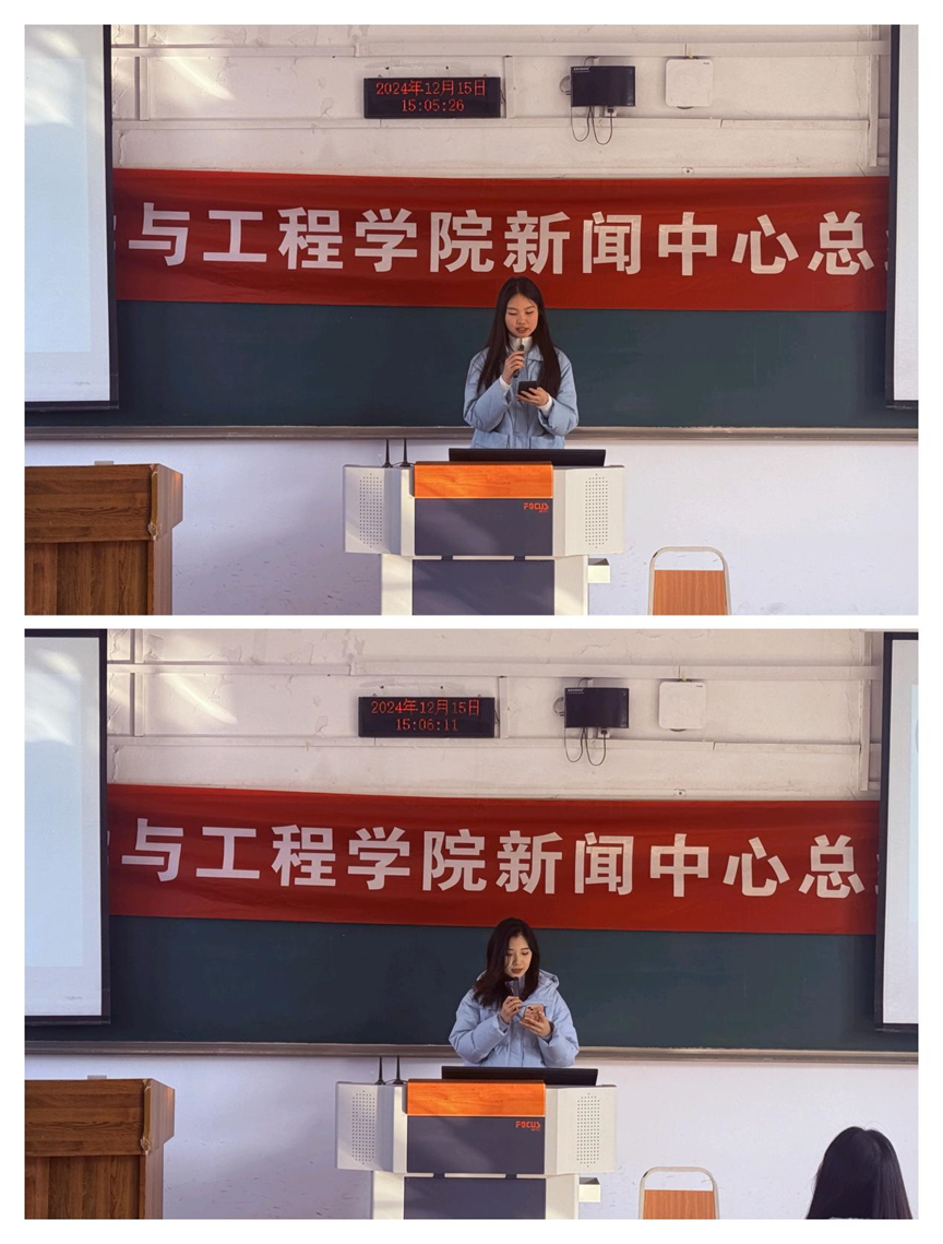 会议伊始,新闻中心主任祖凯悦和张婉怡依次进行全面的总结发言。她们首先回顾了新闻中心在过去一学期里的学习工作成果并对一学期以来大家的辛勤工作表示了肯定和感谢。而后,她们也指出了在工作中存在的问题和不足,并针对性地提出了改进措施和建议,同时也给予新闻中心的部长和干事们未来寄语。