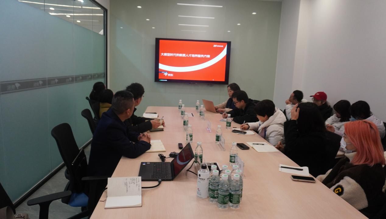 在交流环节,黄经理对京东科技的热情接待表示感谢,接着介绍了此次调研的目的,以及学院在产教结合、学科融合、产业合作等方面的情况,希望能与该院进行跨学院交流学习。双方探讨了如何在新经济背景下加强校企合作,特别是在人才培养和科研项目方面的合作。黄经理表示,希望通过此次交流,能够进一步推动产学研合作,探索新的人才培养模式,以满足数字经济发展的需求。此次参观交流活动不仅增进了双方的了解,也为未来的合作奠定了良好的基础,期待在数字经济领域实现更深层次的合作与发展。