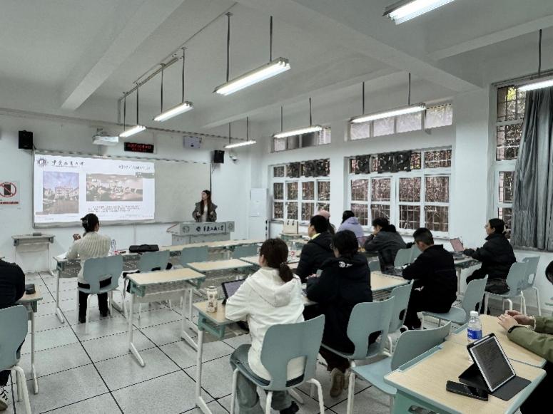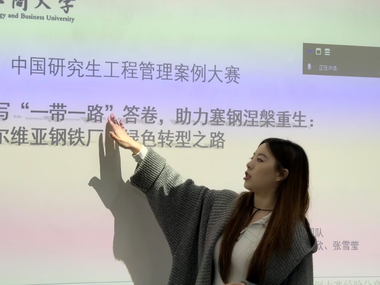 在专题分享环节,获奖团队三位代表依次分享了参赛经验,为课程提供了鲜活的实战案例与方法指导。刘瑞瑶同学以“书写‘一带一路’答卷,助力赛钢涅槃重生——塞尔维亚钢铁厂绿色转型之路”为例,深入解析了案例选题策略与命题优化技巧,展示了如何将时代议题有效融入工程管理案例构建,提升了同学们对选题方向与现实结合点的把握能力。张雪莹同学则聚焦于作品结构搭建与核心内容撰写,从逻辑结构、分析框架到文字表达,系统梳理了高质量竞赛作品的构建路径,增强了员工在案例写作过程中的条理性与表达力。胡欣同学围绕多媒体呈现,介绍了视频制作的流程与实用技术,并结合自身参赛作品的复盘经验,提出具体优化建议,拓展了课堂教学在成果呈现与表达形式上的应用空间。