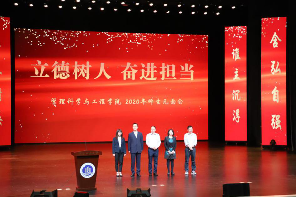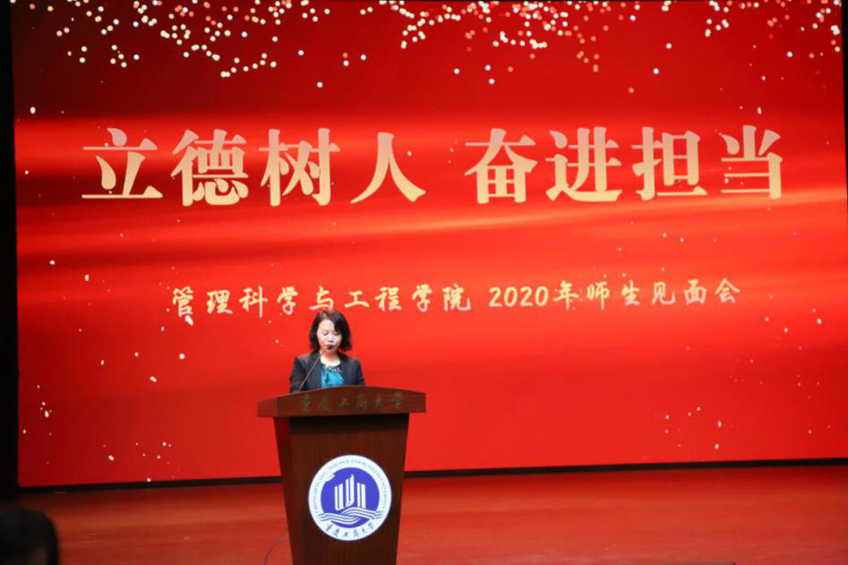 视频结束,研究生代表18级管理科学与工程班吴国奥和本科生代表17级物流三班薛佳慧依次上台发言,他们以学长的身份给学弟学妹们分享自身学习生活经历与经验,希望每一位同学都能够明确学习的目标,一心向学,奋力追逐梦想,不枉此行。信息管理与信息系统系主任唐敏老师作为教师代表上台发言,她寄语同学们“欢迎、传承、创新”,欢迎每一位同学加入全新的管工学院;希望同学们利用学校这个平台,能够传承中华民族智慧,为人生奠定良好基础;还希望同学们在各个领域都能够敢于创新,成就自我。
