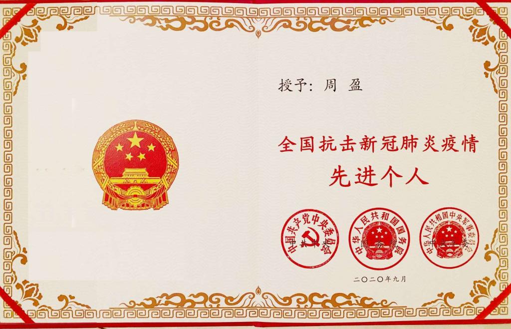 公司员工周盈获评全国抗击新冠肺炎疫情先进个人