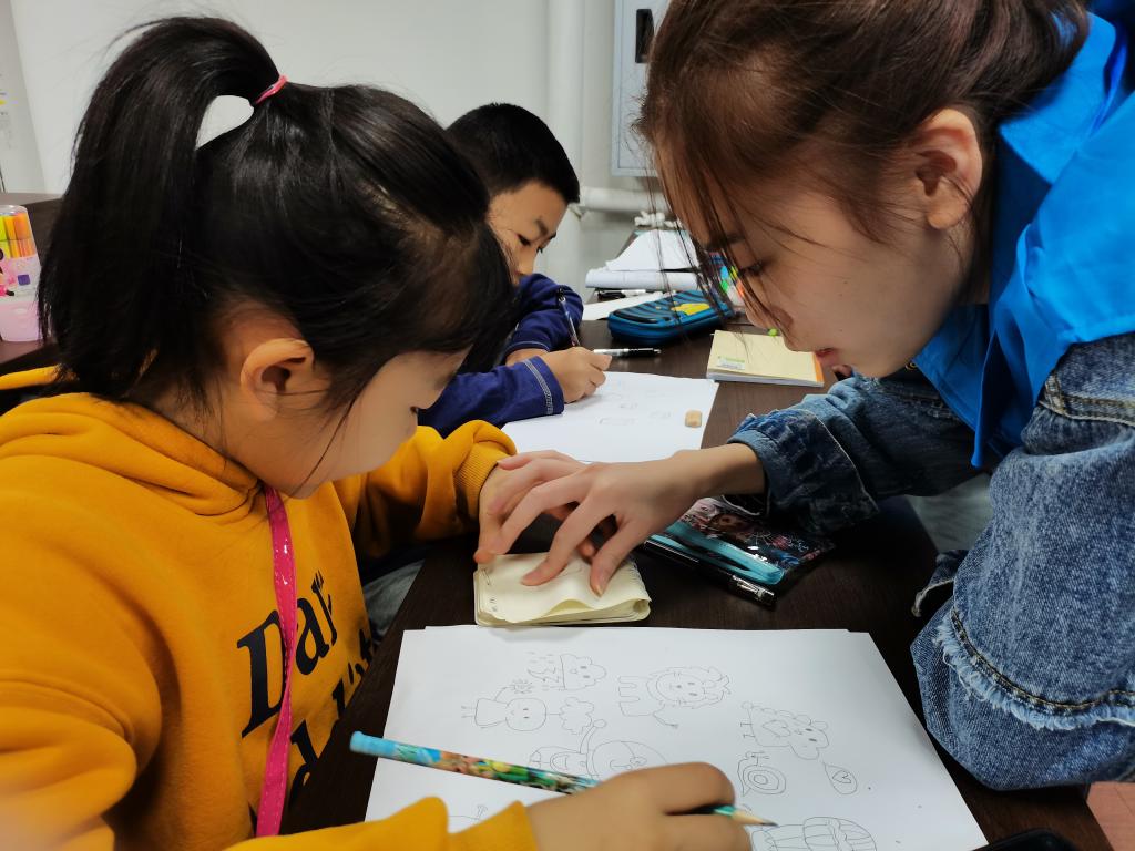 上午十一点,志愿者准时到达半山一村志愿活动室,并穿上会服组织孩子们进行签到。此次课程主要包括画画、洗手小课堂以及作业辅导。志愿者先给每个孩子分发了两张白纸和一支笔,然后拿出先前准备好的卡通图案,一笔一划地教孩子们画图,接着按照孩子们的喜好帮助他们给卡通图案上色,培养孩子们发挥想象力进行创作的能力。绘画结束后,志愿者开始给孩子们讲解“七步洗手”小知识,孩子们都认真聆听,模仿着正确的洗手动作。志愿者给孩子们辅导完周末作业后,活动便接近了尾声,孩子们依依不舍地与志愿者们道别。