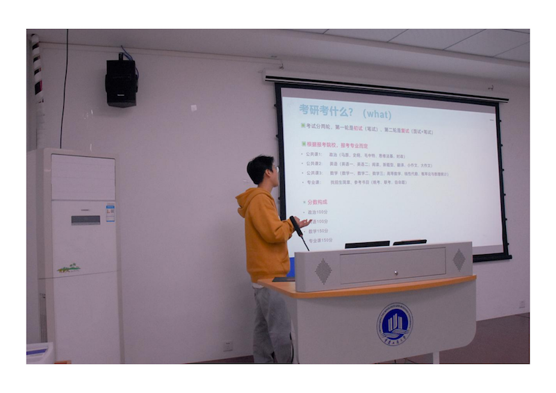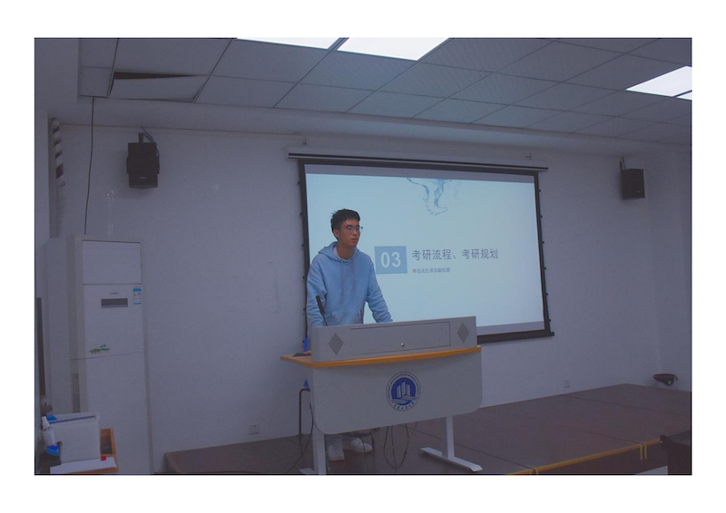 卢骕傲学长的演讲更加侧重于考研备考的实践性。他分享了一些考研的流程及其规划,考研流程为:填写考生信息-预报名-正式报名-网上确认-准考证下载-初试-出国家线、校线、院线-组织复试和调剂等。此外,卢学长就相关的考试科目如英语、政治、数学、专业课等给出了自己的学习建议,分享了相关的学习软件,让同学们获益匪浅。